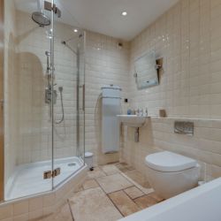 Bathroom - deep bath, separate shower, sink, heated towel rail and WC.