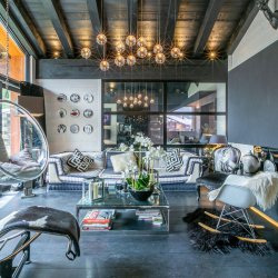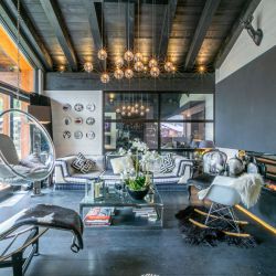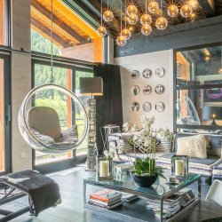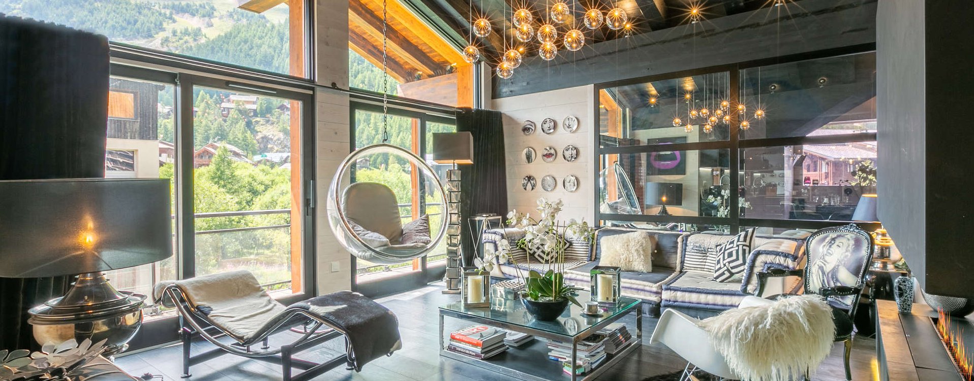 Open plan Living/Dining area with high ceilings, picture windows, TV, quirky easy chairs, large sofa and round dining table.