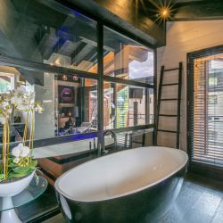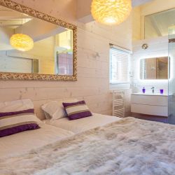 Master Bedroom - Double bed (170x1200cm) with TV, west-facing balcony, ensuite spacious bathroom including freestanding oval bath, separate shower and double sinks and WC.