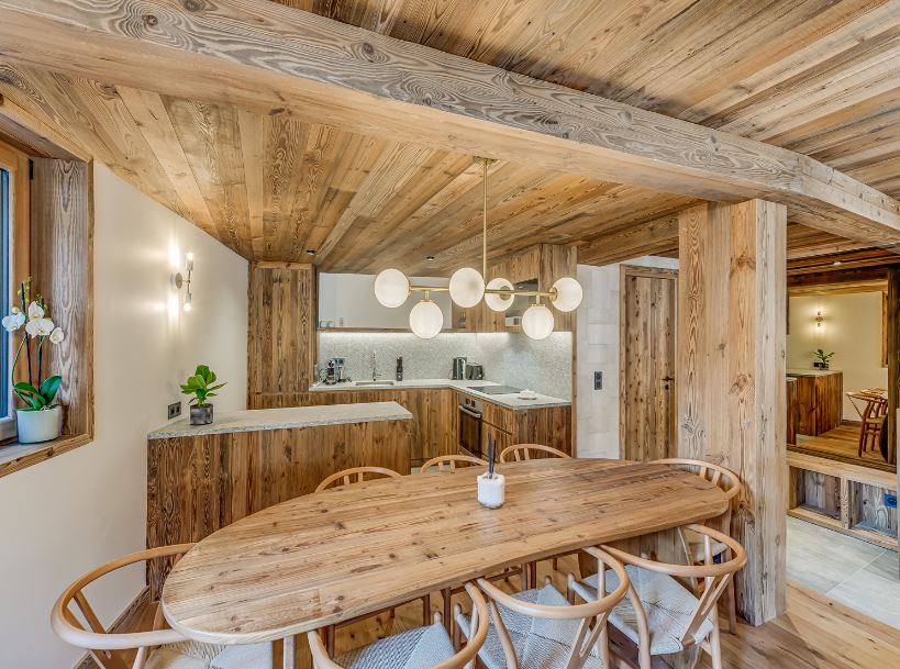 The upper entrance level open up to the open plan living space with comfortable seating, fireplace, dining area and well equipped kitchen. The private balcony offers reat views of the resort. The ski / boot room is tucked away in the corner of this floor.