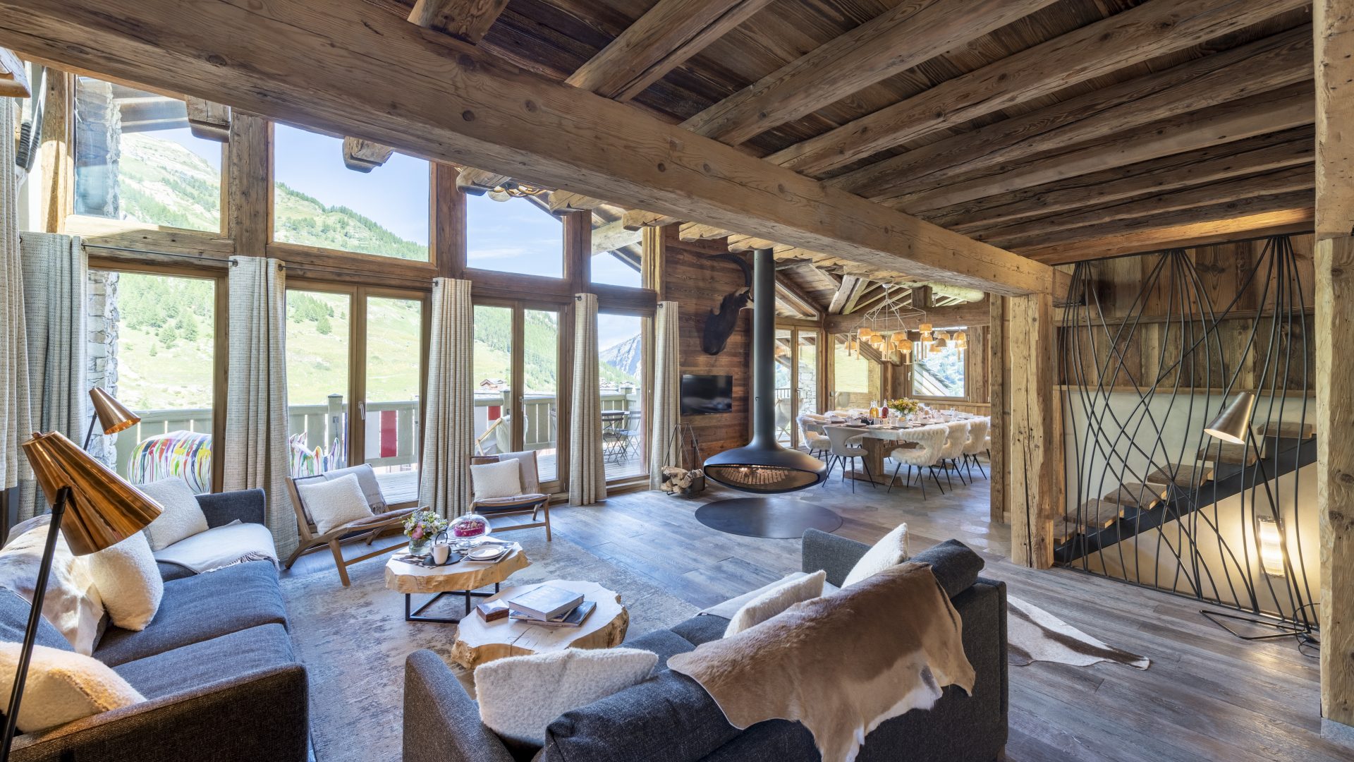 - Stunning open plan living space on top floor of the chalet with vaulted ceiling and double height windows.