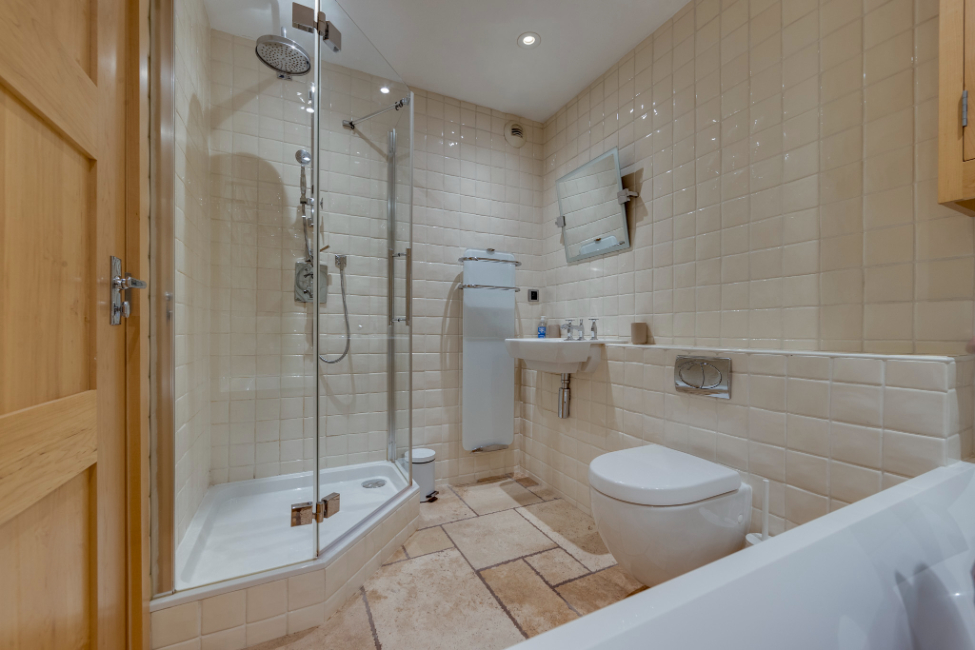 Bathroom - deep bath, separate shower, sink, heated towel rail and WC.
