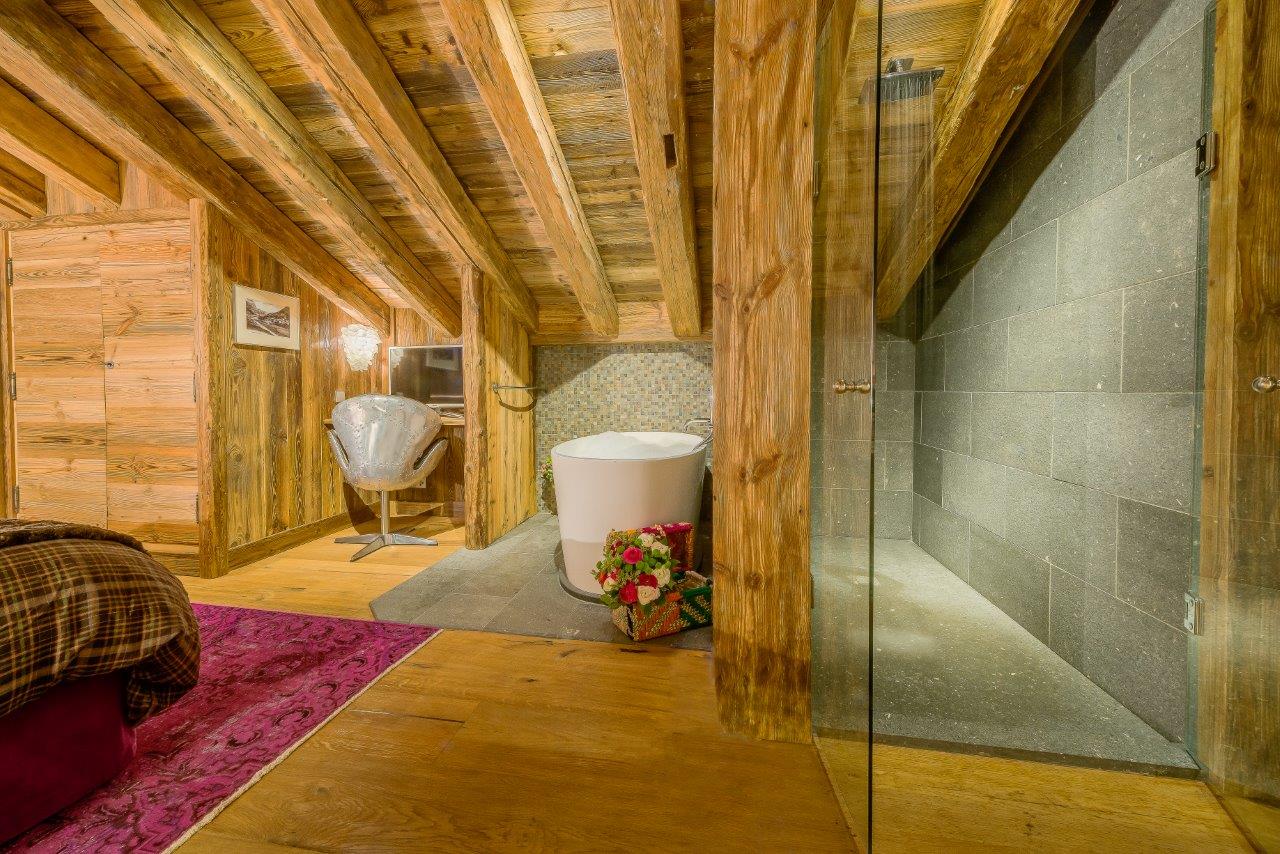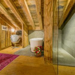 Chalet Jupiter has four double bedrooms each with its own en-suite bathroom. The master has an open-plan bathroom with a bath tub in the corner of the room and the other three bedrooms each have a shower.