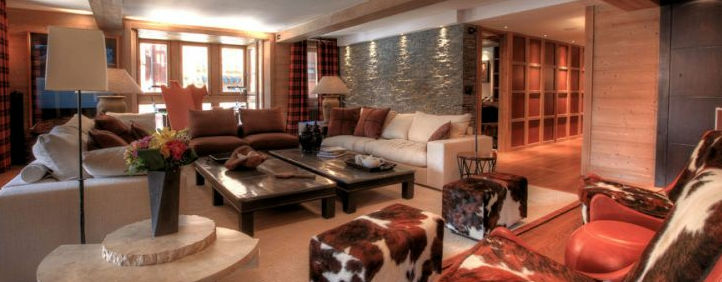The lounge and dining room are one open plan area, but a large chimney divides the area wonderfully. The living area comprises voluminous white sofas and designer chairs which provide a luxury mountain feel. There are also cow hide arm chairs by the fire for late night relaxing or reading.